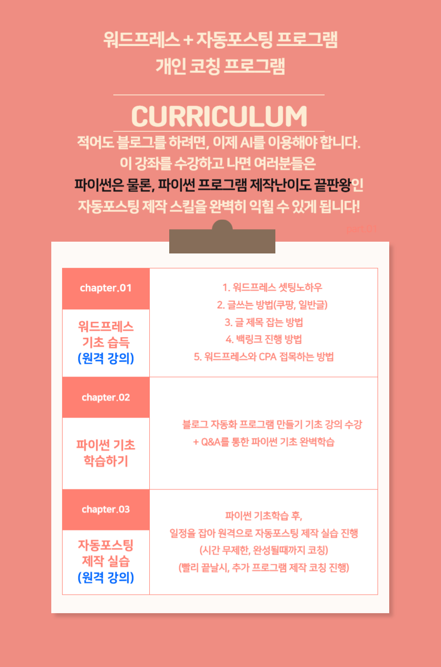 기본 커리큘럼은 위와 같으나, 개인 수준별 맞춤 코칭이 진행되며 자동포스팅 프로그램을 완성할때까지 무제한 코칭을 진행합니다. '블로그 자동화'라는 목적을 기반으로 파이썬 1:1 맞춤 교육을 진행합니다.